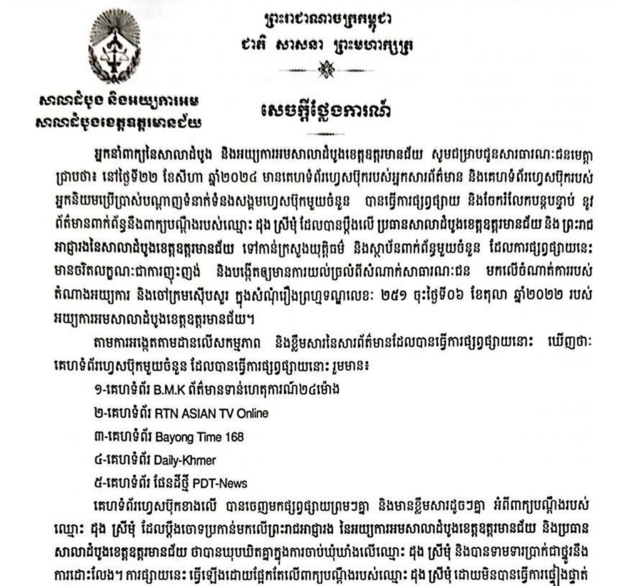 ដើម្បីកុំឱ្យមានការយល់ច្រឡំពីមហាជន អ្នកនាំពាក្យ សាលាដំបូង ខែត្រឧត្តរមានជ័យ បានចេញសេចក្ដីថ្លែងការណ៍បំភ្លឺចំនួនបីទំព័រយ៉ាងក្បោះក្បាយ។ ខាងក្រោមនេះ ជាការពន្យល់របស់អ្នកនាំពាក្យ សាលាដំបូង ខែត្រឧត្តរមានជ័យៈ
