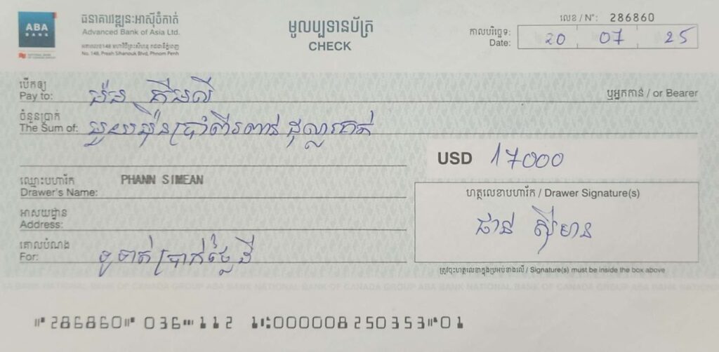 លោក ម៉ម គឹមលី បានយក មូលប្បទានបត្រ ( សែក: CHeck ) មួយសន្លឹកចុះថ្ងៃទី២០ ខែកក្កដា ឆ្នាំ២០២៥ ដែលមានទឹកប្រាក់