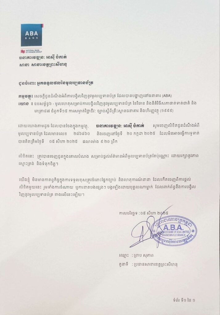 បានបញ្ជាក់ប្រាប់លោក ម៉ម គឹមលី ថា « សូមចេញលិខិតជូនដំណឹងអំពី មូលប្បទានបត្រ ដែលមានលេខ ២៨៦៨៦០ និងចេញ