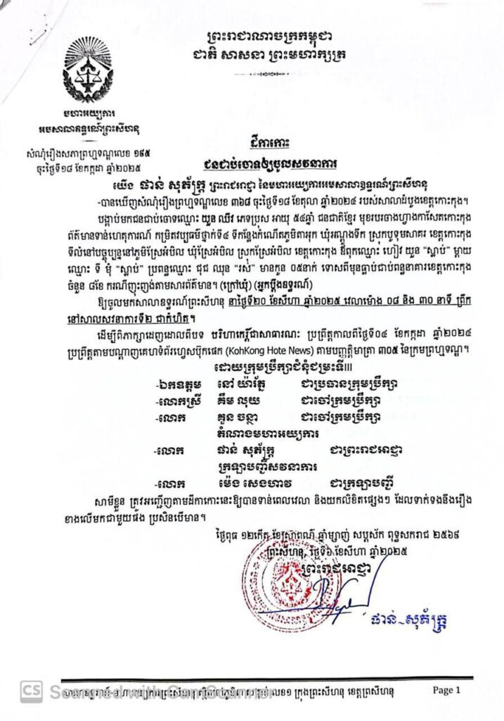 បានចេញដីកាកោះ ចុះថ្ងៃទី៦ ខែសីហា ឆ្នាំ២០២៥ បង្គាប់ឱ្យលោក យូន ឈីវ ចូលមក សាលាឧទ្ធរណ៍ ខែត្រព្រះសីហនុ នា